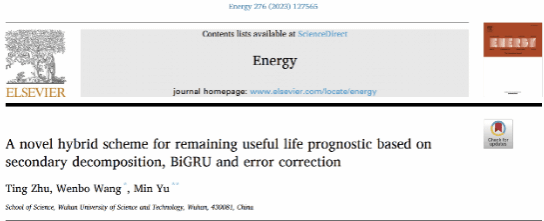 近日,太阳集团2007网站博士朱婷、教授王文波、老师喻敏合作在《Energy》期刊上发表题为“A novel hybrid scheme for remaining useful life prognostic based on secondary decomposition, BiGRU and error correction”的研究论文。该期刊系JCR及中科院SCI双一区TOP期刊,2022年影响因子为8.857,该期刊重点关注能源经济分析、能源建模和预测、综合能源系统、能源规划和能源管理,是能源研究领域内最有影响力和最权威的期刊之一。朱婷博士为第一作者,王文波、喻敏为共同通讯作者,太阳集团2007网站为第一单位。