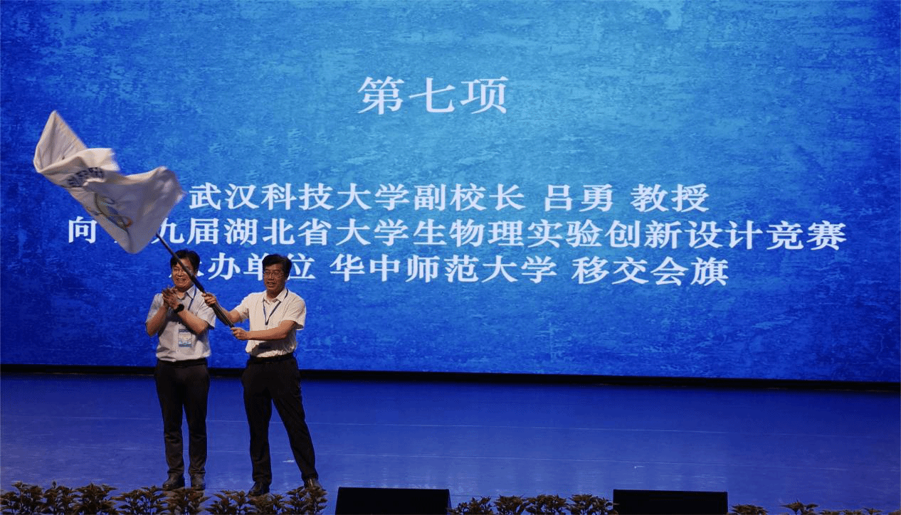 太阳集团2007网站副校长吕勇教授向第九届湖北省大学生物理实验创新设计竞赛承办单位华中师范大学移交会旗。
