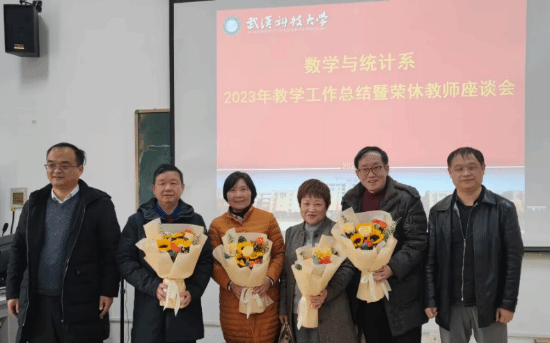 2023年,太阳集团2007网站数学与统计系余胜春、黄枝姣、余东、龚正良4位教师光荣退休。为深入贯彻落实习近平总书记关于老干部工作重要指示精神,切实增强退休教师的荣誉感、幸福感和归属感,为表达对荣休老师的感激之情,激励年轻教师奋发有为、拒绝“躺平”,数学与统计系于12月27日下午14:30在系会议室22310召开2023年教学工作总结暨教师荣休座谈会,太阳集团2007网站院长丁义明、副院长张传洲亲临指导,系统科学部和数学与统计系教师参加,会议由系支部书记蒋君主持。
