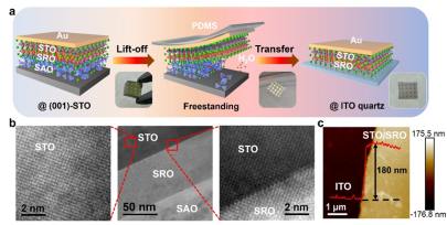 研究背景:随着电子器件及设备技术的发展,如何在传统半导体基底如硅基衬底上实现单晶氧化物薄膜的制备、并自上而下构筑功能器件是目前科学家关注的重要科学问题,新型柔性自支撑单晶氧化物薄膜基于其室温转移优势和强关联电子体系的新颖物性,在组装构建新型氧化物电子器件领域具有巨大的应用潜力。