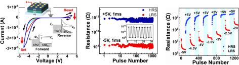 研究亮点: 我院物理系李莹副教授团队与哈尔滨工业大学吕伟明教授团队合作,设计研发出一种基于自支撑单晶氧化物薄膜组装的新型人工突触忆阻器,该人工突触忆阻器器件表现出良好的阻变性能及神经突触行为。具体地,基于李莹副教授研究团队的前期研究工作(Stacking and twisting of freestanding complex oxide thin films, 2203187, Advanced Materials (2022). https://doi.org/10.1002/adma.202203187),本研究提出通过转移堆叠高质量单晶钛酸锶薄膜于导电玻璃ITO基底,组装制备出新型垂直叠层结构忆阻器器件(图1)。值得注意的是,该忆阻器表现出优越的阻变性能,包括接近104的开关比、高于1000次的循环切换耐受度、长达105 s的高低阻态保持特性和多级阻态调控效应(图2)。此外,在脉冲电压的刺激下,该忆阻器可模拟实现双脉冲易化、短时程可塑性(STP)、长时程可塑性(LTP)、脉冲频率依赖可塑性等关键神经突触性能,实现新型人工突触忆阻器的构建。团队基于该突触忆阻器进一步构建了储备池神经网络计算系统,实现高精度的手写数字识别,可靠率达到90%以上(图4)。本研究为开发新型氧化物薄膜功能器件提供了可行性策略,突破了传统氧化物薄膜器件的高温高压制备条件和外延生长基底的瓶颈限制,有望在新型氧化物半导体器件及神经突触模拟/神经网络计算等领域实现应用价值。