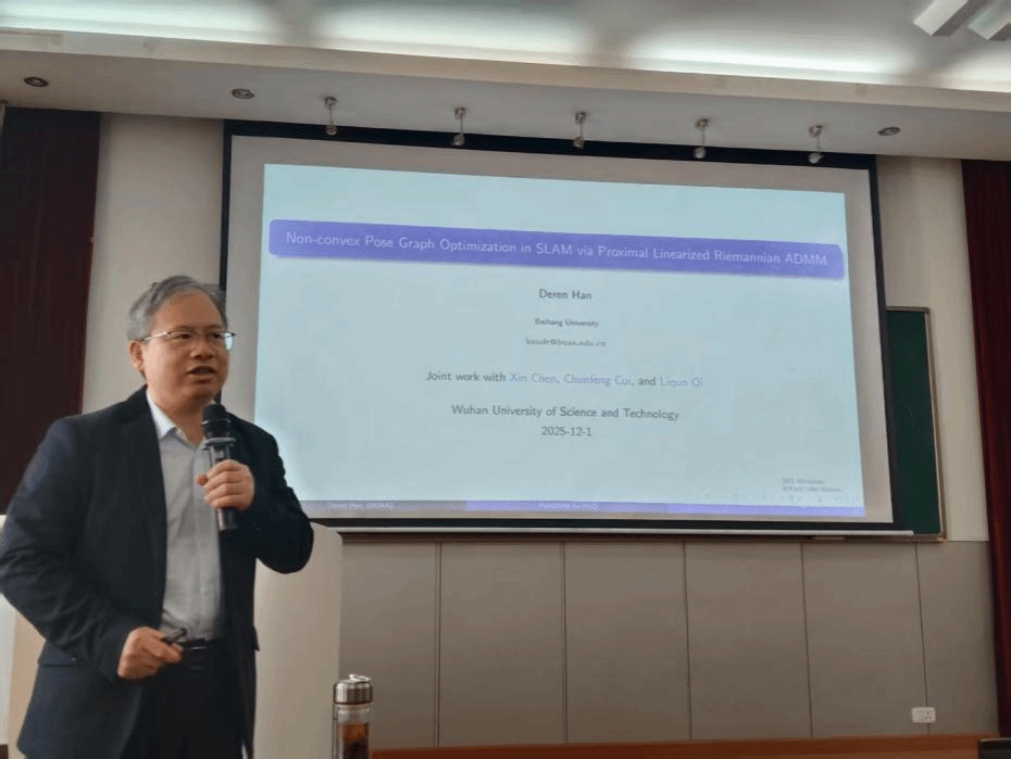 座谈会后,韩德仁教授面向太阳集团2007网站研究生和青年教师作题为《Non-convex Pose Graph Optimization in SLAM via Proximal Linearized Riemannian ADMM》的学术前沿报告。