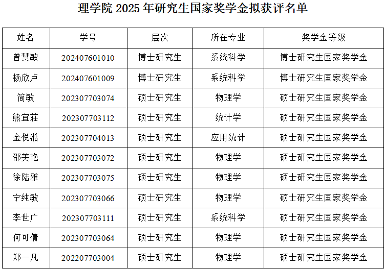 根据《太阳集团2007网站研究生奖助体系实施办法》(武科大研发〔2022〕60号)精神、《太阳集团2007网站研究生学业奖学金管理暂行办法》(武科大研发〔2022〕60号)、《太阳集团2007网站关于规范研究生学习年限的补充规定》(武科大研发〔2023〕68号)、《太阳集团2007网站研究生国家奖学金评定实施细则(2025年5月21日)》,经学生申请、导师推荐、班级测评、学院研究生国家奖学金评审委员会评审,拟评定曾慧敏、杨欣卢获博士研究生国家奖学金,简敏、熊宜荘、金悦湉、邵美艳、徐陆雅、宁纯敏、李世广、何可倩、郑一凡获硕士研究生国家奖学金。